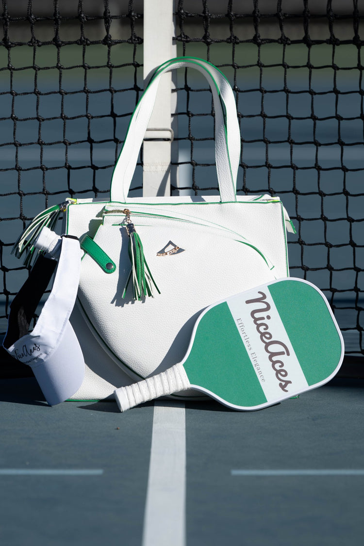 Available in four curated colorways—Citron Creme, Pink Sorbet, Forest Berry, and Greenleaf Snow—the Madison Tennis Tote brings elegance, practicality, and unmistakable NiceAces refinement to every setting.